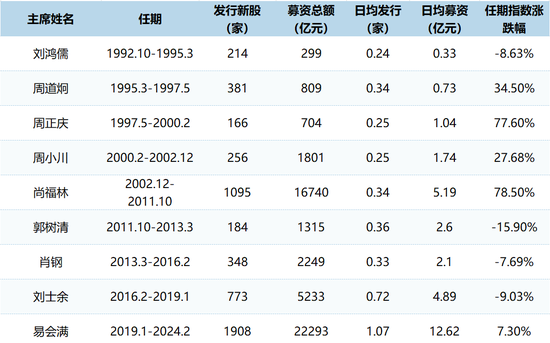 从历史对比来看,从首任证监会主席刘鸿儒到易会满,九任主席共计发行了5386只新股,募资总额5.34万亿元。易会满任内发行新股数量占比达到惊人的35.43%,募资金额占比更是高达41.59%,真正实现了“前无古人”的IPO壮举。